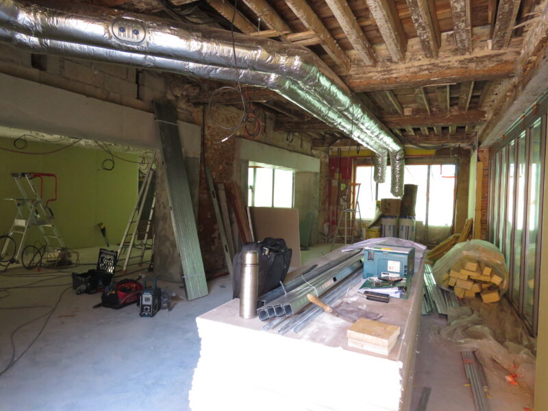 Les travaux de la Halle Marie de Lorraine concernent actuellement essentiellement l’aménagement des espaces intérieurs (ventilation, électricité, isolation, placo…) mais également la façade en brique et pierre derrière le filet vert bien visible de la rue. Elle est entièrement restaurée (rejointoiement, remplacement des pierres et briques abîmées, reprises de petites parties manquantes avec enduits…) et devrait largement participer à l’embellissement de la rue Camille Desmoulins !