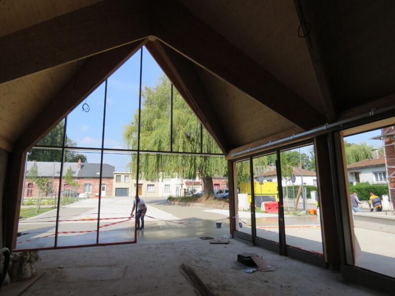 Les dalles béton extérieures viennent d’être coulées sur le parvis de la Halle Marie de Lorraine. Il devient plus facile de s’imaginer à quoi va ressembler ce nouvel espace, plus ouvert et plus accueillant. Les maçons continuent de travailler sur la façade, les menuisiers vont poursuivre la pose des baies, verrières et vitres ; tandis que les élus et les services travaillent à l’inauguration et l’animation future des espaces…