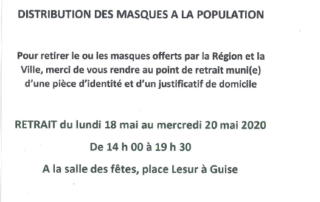 Retrait des masques : du 18 au 20 mai, de 14h à 19h30 à la Salle des Fêtes de Guise