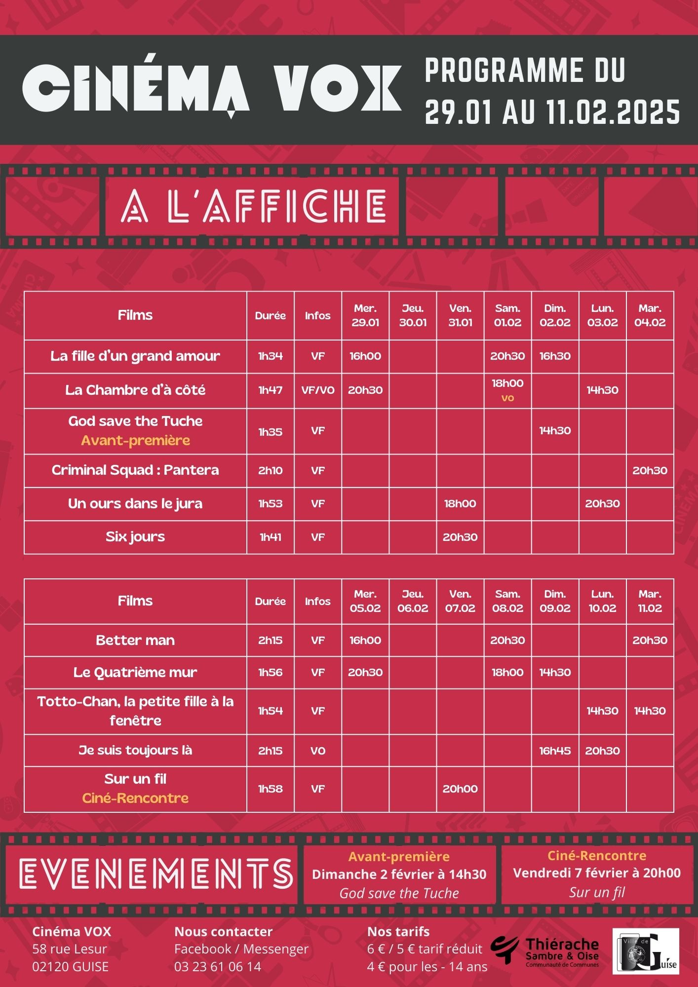 Cinéma – Programme du 01 octobre au 14 octobre 2025 Galerie Cinéma – Programme du 01 octobre au 14 octobre 2025 Cinéma Cinéma – Programme du 01 octobre au 14 octobre 2025Par ana2608|2025-09-29T16:38:34+02:0030 septembre 2025|Cinéma|Commentaires fermés sur Cinéma – Programme du 01 octobre au 14 octobre 2025 Lire la suite
