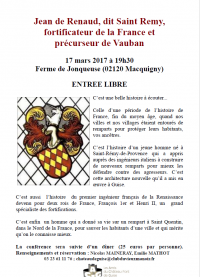 ![]() Conférence Jean de Renaud, dit St Rémy, fortificateur de la France et précurseur de Vauban qui sera donnée le vendredi 17 mars 2017, à 19h30, à la Ferme de Jonqueuse (02120 Macquigny), par Jacques Duclaux, biographe de Jean de Renaud. L'accès est libre et gratuit. |