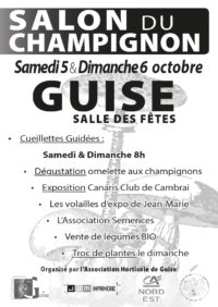 ![]() Samedi 5 et dimanche 6 octobre salle des fêtes de GUISE Salon du Champignon organisé par l 'Association Horticole de GUISE DE 8H à 18H. Cueillettes guidées en forêt départ 8h puis exposition, dégustation d'omelette aux champignons exposition d'oiseaux exotiques et volailles d'ornement. légumes bio, initiation au compostage, expos de Geodomia, girouettes, sculptures sur bois […] |