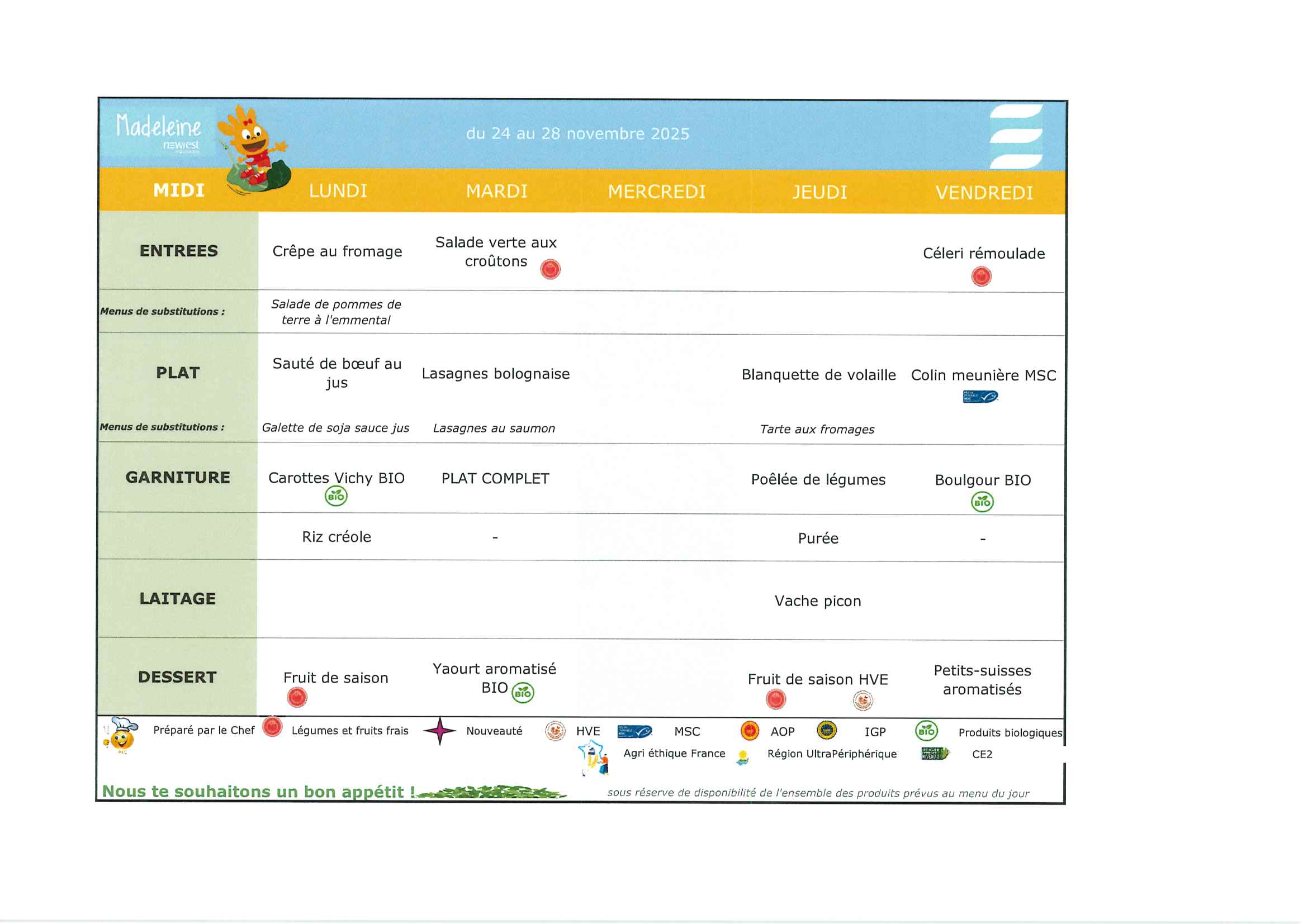 Voir l'image agrandie Scolaire – Menu de la cantine du 24 au 28 novembre 2025Par ana2608|2025-10-13T15:08:25+02:0012 novembre 2025|SCOLAIRE|Commentaires fermés sur Scolaire – Menu de la cantine du 24 au 28 novembre 2025Share This Story, Choose Your Platform!FacebookTwitterRedditLinkedInTumblrPinterestVkEmail À propos de l'auteur : ana2608 Articles similaires Scolaire – Menu de la cantine du 17 au 21 novembre 2025 Galerie Scolaire – Menu de la cantine du 17 au 21 novembre 2025 Scolaire – Menu de la cantine du 10 au 14 novembre 2025 Galerie Scolaire – Menu de la cantine du 10 au 14 novembre 2025 Scolaire – Menu de la cantine du 03 au 07 novembre 2025 Galerie Scolaire – Menu de la cantine du 03 au 07 novembre 2025 Scolaire – Menu de la cantine du 13 au 17 octobre 2025 Galerie Scolaire – Menu de la cantine du 13 au 17 octobre 2025 Scolaire – Menu de la cantine du 06 au 10 octobre 2025 Galerie Scolaire – Menu de la cantine du 06 au 10 octobre 2025
