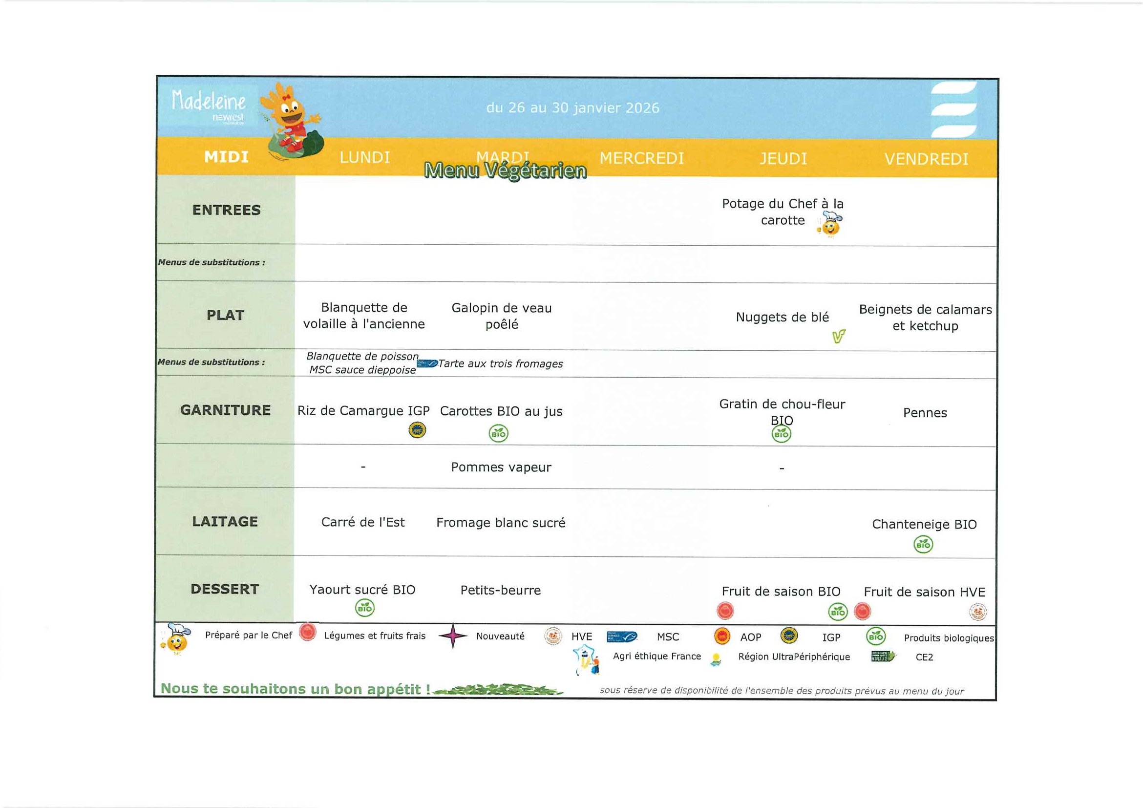 Voir l'image agrandie Scolaire – Menu de la cantine du 26 au 30 janvier 2026Par ana2608|2025-12-16T14:13:09+01:0014 janvier 2026|SCOLAIRE|Commentaires fermés sur Scolaire – Menu de la cantine du 26 au 30 janvier 2026Share This Story, Choose Your Platform!FacebookTwitterRedditLinkedInTumblrPinterestVkEmail À propos de l'auteur : ana2608 Articles similaires Scolaire – Menu de la cantine du 19 au 23 janvier 2026 Galerie Scolaire – Menu de la cantine du 19 au 23 janvier 2026 Scolaire – Menu de la cantine du 12 au 16 janvier 2026 Galerie Scolaire – Menu de la cantine du 12 au 16 janvier 2026 Scolaire – Menu de la cantine du 05 au 09 janvier 2026 Galerie Scolaire – Menu de la cantine du 05 au 09 janvier 2026 Scolaire – Menu de la cantine du 15 au 19 décembre 2025 Galerie Scolaire – Menu de la cantine du 15 au 19 décembre 2025 Scolaire – Menu de la cantine du 08 au 12 décembre 2025 Galerie Scolaire – Menu de la cantine du 08 au 12 décembre 2025